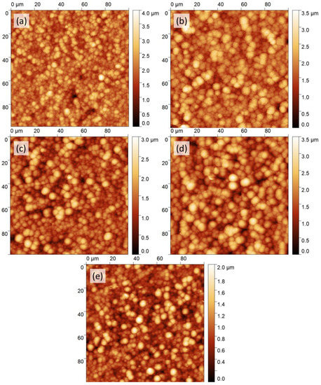 AFM images of the deposited coatings: (a) NiB10-80, (b) NiB40-80, (c) NiB40-85, (d) NiB20-85, and (e) EN.