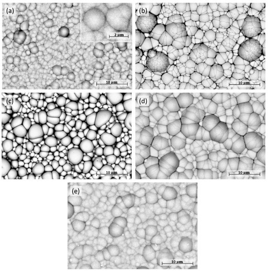 PFIB-SEM images of the surface of electroless Ni-B and Ni coatings: (a) NiB10-80, (b) NiB40-80, (c) NiB40-85, (d) NiB20-85, (e) EN.
