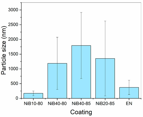 Figure 3 shows the average particle size that built up the deposited coatings. Electroless Ni (EN) and NiB10-80 contained finer, nano-sized particles distributed over smaller size ranges of 70–600 nm and 20–300 nm, respectively. When increasing the Ni-concentration of the bath, the particle size also increased (NiB10-80 and NiB40-80). The same tendency applied to the effect of the temperature increment (NiB40-80 and NiB40-85). However, when lowering the Ni concentration of the bath (from 40 to 20 g/L), the particle size decreased, even though the concentration of the reducing agent was elevated (NiB20-85). It is important to note that these nodular particles did not reflect the fine crystalline/amorphous structure of the coatings. After the heat treatment of the coatings, the surface morphology usually remains the same, while the crystallization and precipitation of NixBy phases take place [37,51].
