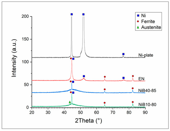 The XRD patterns of Ni-B and Ni coatings, as well as the bulk Ni plate, are shown in Figure 4. The high-intensity characteristic Ni peaks referred to the microcrystalline structure of the Ni plate. In the case of the coatings, ferrite reflections were visible at 2Θ = 44.5°, 65°, and 82.5°, which originated from the steel substrate. At 2Θ = 44.5°, both Ni and ferrite peaks are expected to appear, while Ni has other reflections at 2Θ = 52° and 77°. However, in the case of the Ni-B samples, only a broad peak of Ni at 2Θ = 44.5° could be observed near the ferrite reflection, which referred to the X-ray amorphous structure of the coatings. These observations are in agreement with the literature, as it was reported, that high-B electroless Ni-B coatings are amorphous in the as-deposited state and consist of microcrystalline Ni and amorphous Ni-B phases, with an increasing amorphous phase ratio as a function of the B content [52,53]. For NiB10-80, the small peak of austenite at 2Θ = 43.5° could also be observed, which was not visible in the case of the other coatings. This was attributed to the lower mass, i.e., the smaller thickness of the coating (Table 4), as the thinner coating was more transparent to the X-ray. However, in the case of the pure Ni coating (EN), a relatively higher intensity diffraction peak could be seen at 2Θ = 44.5°, while the width of the amorphous peak was also reduced. Furthermore, Ni peaks at higher 2Θ values also appeared. These observations referred to an ordered atomic arrangement, i.e., to the crystalline structure of the coating compared with the Ni-B samples [54]. It can be concluded that the obtained results confirmed the observations of the effect of the B content on the formation of an amorphous phase reported in the literature [55,56].