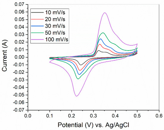 When increasing the scan rate to 100 mV/s, the same tendency could be observed regarding the peak currents and the CV curve area of the samples; however, the two distinct cathodic and anodic peaks were superimposed and could no longer be distinguished (Figure 5b). Another difference was the shift in the reduction peaks toward more negative potentials and the anodic peaks toward more positive potentials (Figure 6). This kind of behavior is usually attributed to the increase in the internal diffusion resistance within the electrode materials [61,62,63]. The diffusion rate of electrolytic ions was not sufficient to carry out the redox reactions depicted in Equations (4) and (5). The shift in the peak potentials can be seen in Figure 6, which presents the CV curves of the NiB40-80 sample.