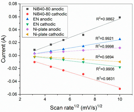 Plots of the anodic and cathodic peak currents of NiB40-80, EN, and Ni plate as functions of the square root of the scan rate.