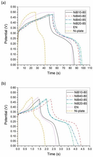Galvanostatic charge–discharge tests were performed to further analyze the electrochemical behavior of the samples with different discharge current densities. The measurement produced quasi-symmetric curves, as seen in Figure 8. The non-linear shape of the slopes corresponding to the charge–discharge processes confirmed the pseudocapacitive nature of the samples [66]. The time difference required for a charge–discharge cycle between the Ni plate and the electroless coatings was more pronounced with a lower discharge current (Figure 8a). The time required for one cycle was at least two times longer for the coatings than for the Ni plate, indicating higher charge-storage capability. This was attributed to the larger surface area and supposedly to the B content of the Ni-B coatings. As shown, the charging potential range slightly decreased to 0.48 V for the electroless coatings. After charging, the potential dropped rapidly in the interval of 0.5 and 0.3 V, followed by a plateau of a slower potential drop. The interval of the rapid potential drop referred to the cathodic peak of CV curves (Figure 5), while the inflection point of this section corresponded to the cathodic peak currents [14,67].