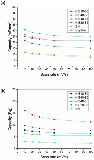 At both scan rates, the largest area of the CV curve was presented by NiB40-80; thus, the highest capacity was expected for this sample. When comparing sample EN with the Ni plate, it was noticeable that EN had a slightly larger CV area. It is known that both the specific surface area and the structural disorder of amorphous electroless coatings can contribute to the increment in the area of the CV curves [36,64]. As EN had a similar microcrystalline structure to the Ni plate (Figure 4), the difference was attributed to the increased surface area of the coating.