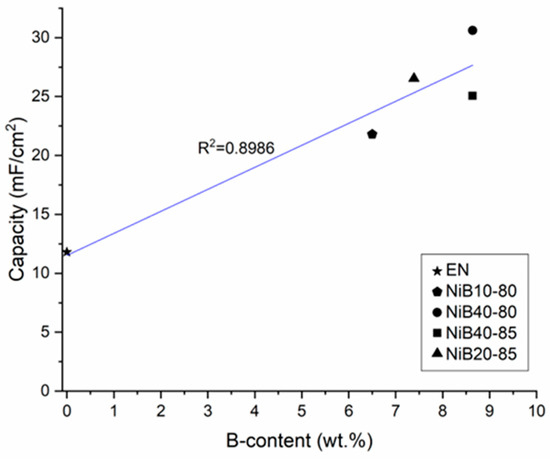 In this section, we are looking for the connection between the structural/chemical properties of the coatings investigated in Section 3.1 and Section 3.2 and their supercapacitive behavior. Figure 10 shows the specific capacity of the coatings as a function of their B content. As can be seen, the capacitance increased linearly with the B content, fitting the correlation with an appropriate coefficient of determination (R2 = 0.8986). The first datapoint of the Ni-B coatings is relatively far from that of pure Ni; however, to acquire a low B content, usually, the use of another reducing agent (DMAB) is required [31]. The enhancing effect of the B alloying element can be ascribed to the combined effect of the following factors: (a) B is a very electronegative element (χ = 2.04, with an equilibrium potential of −1.81 V vs. NHE, in alkaline medium) [59], carrying the potential to act as a high-energy-density electrode material. Although B has relatively low conductivity (1 × 10−6–7 × 10−8 ), the B element is uniformly dispersed in the matrix of the Ni-B alloy phase, resulting in a conductivity close to that of metals [59]; (b) Transition metal–boride alloys possess a special electronic structure, an ionic bond between the metal and boron atoms, that is different from the usually covalent bond of transition metal–boride compounds, and from the metallic bond as well. Transition metals donate electrons to B, weakening its chemical stability while improving the chemical activity and weakening the passivation effect of the surface metal atoms [59,71]; (c) The presence of B promotes the formation of a disordered amorphous structure (see Figure 4), thereby decreasing the lattice energy, which facilitates fast ion intercalation/deintercalation on the surface during the charging–discharging processes [72].