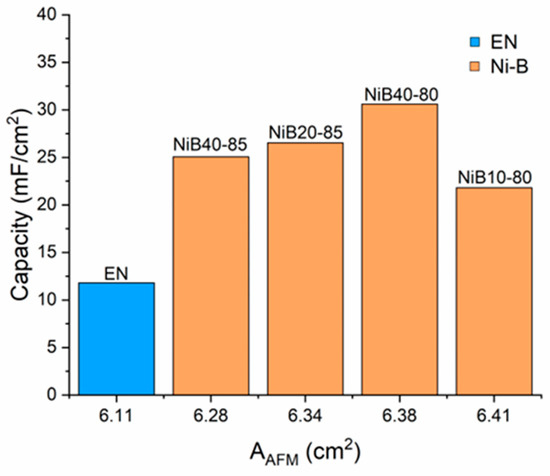 The relationship between the AFM surface area of the coatings and their capacitance is shown in Figure 11. As discussed earlier, pure electroless Ni (EN) has the lowest surface area and capacitance. In the case of Ni-B coatings, the capacitance increased in the first three samples, but then decreased with a further surface area increase. This might be contradictory at first sight, as studies on pseudocapacitive behavior report on the positive effect of the specific surface area [16,73,74]. However, it should be considered that AFM only measures the curvature of the surface particles and cannot inform us about the actual pore structure. To take the pore structure into consideration, we need another parameter. The PFIB-SEM images revealed that the pore structure of the coatings was largely determined by the boundaries of the fine particles that built up the coating (Figure 2). Thus, the particle size distribution of the coatings (Figure 3) could be used to characterize the surface area available to the electrolyte [75].