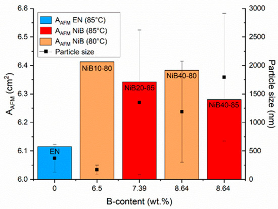 where is the specific surface area of the particles, is the surface area of the particles (nm2), is the volume of the particles (nm3), and is the particle diameter (nm). With increasing particle diameter, the specific surface of the particle decreased, which resulted in the decrease in the surface area of the coating as well. Similar observations were reported by Baskaran et al. [38], as the particle size of the electroless Ni-B coatings increased with increasing B content. From Figure 12, it can be seen that it was not only the B content that determined the particle size, but also the temperature, the effect of which was mentioned earlier in Section 3.2.