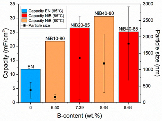 Figure 13 shows the capacitance and particle size as functions of the B content of the coatings. As discussed before, the B content clearly enhanced the capacity of the coatings. In the case of the samples containing the same amount of B (8.64 wt.%), a larger capacitance value was achieved with a smaller particle size i.e., higher porosity of the coatings. As mentioned earlier, the porosity of the coatings was due to the presence of boundaries between the fine particles. The width of these boundaries was in the range of 10–200 nm (Figure 2); thus, it could be accessed by the electrolytic ions, increasing the active sites on the surface, and finally resulting in an increase in the capacitance.