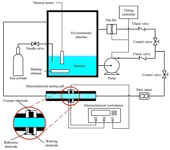 A testing device that enables CO2 corrosion electrochemical tests under gas–liquid intermittent flow conditions was designed and assembled, as shown in Figure 1. The device includes a corrosion electrochemical testing cell, an environmental chamber, a gas pump, a timing controller, a liquid pump, a supersonic flow meter, a heating element, a temperature controller, and pipes and fittings that connect each component. The timing controller was frequently switched between the liquid pump and gas pump so that only one works at a time and creates the intermittent gas–liquid flow that flows through the testing cell. The electrochemical testing cell enables in situ 3-electrode electrochemical tests under different flow conditions. The dimension of the cross-section of the electrochemical testing cell was 20 mm × 20 mm. The inclination angle of the electrochemical testing cell is adjustable between −30° and 30°, and a 0° inclination angle (i.e., the electrochemical testing cell is horizontally placed) was maintained for the experimental study in this work. The heating element, the thermal sensor, and the temperature controller can control the temperature according to the specific requirement of an experimental test.