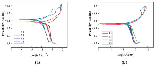 Potentiodynamic polarization plots of X70 steel under different gas–liquid ratios and at the liquid flow velocity of (a) 0.5 m/s and (b) 2 m/s.