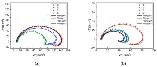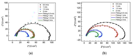 EIS plots of X70 steel under different liquid flow velocities and gas–liquid ratios: (a) 5:1 and (b) 0:1.