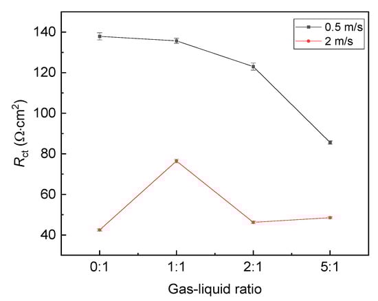 The fitting result of Figure 3, i.e., Rct, is plotted versus the gas–liquid ratio, as shown in Figure 5. It shows that Rct at the liquid flow velocity of 0.5 m/s is always larger than that at the liquid flow velocity of 2 m/s, indicating that the corrosion rate at the flow velocity of 0.5 m/s is lower. In addition, at the liquid flow velocity of 0.5 m/s, Rct decreases with the gas–liquid ratio. The trend is slightly different at the liquid flow velocity of 2 m/s. When the gas–liquid ratio increases, Rct increases first and then decreases, so the effect of the gas–liquid ratio on the corrosion behavior also depends on the flow velocity.