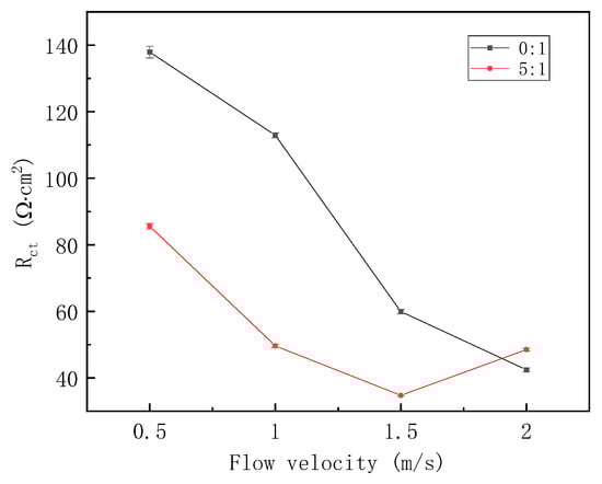 EIS plots in Figure 6 were also fitted, and the fitting result of Rct versus the flow velocity is shown in Figure 7. For the gas–liquid ratio of 0:1, Rct decreases monotonously with the increasing flow velocity. This illustrates that corrosion rate is enhanced at a higher flow velocity. For the gas–liquid ratio of 5:1, Rct decreases at first and then increases, so the effect of flow velocity on corrosion rate can be reshaped by the gas–liquid intermittent flow. In addition, except for the liquid flow velocity of 2 m/s, at other flow velocities, Rct for the gas–liquid ratio of 0:1 is always larger than that of 5:1, showing that a higher gas–liquid ratio is capable of enhancing the corrosion rate to some extent at relatively small flow velocities.