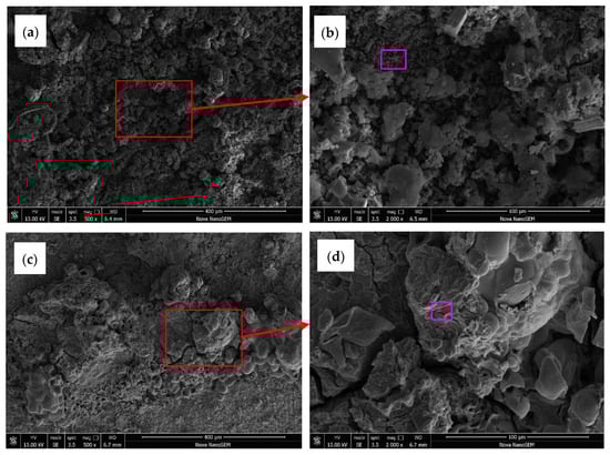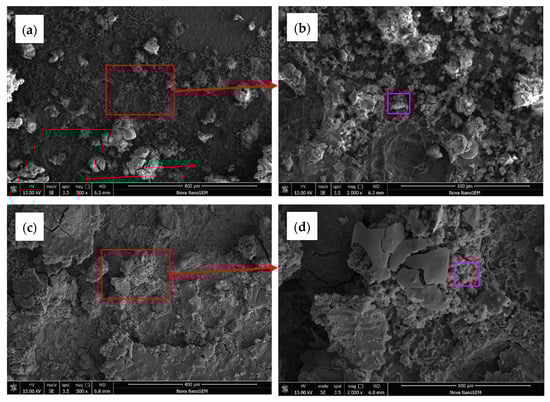 SEM plots of X70 steel under the liquid flow velocity of 0.5 m/s and different gas–liquid ratios: (a,b) 5:1 and (c,d) 0:1. (Note: (b) and (d) are the enlargement of local area of (a,c), respectively, as indicated by the red rectangle. The purple rectangles in (b,d) represent EDS detection area).