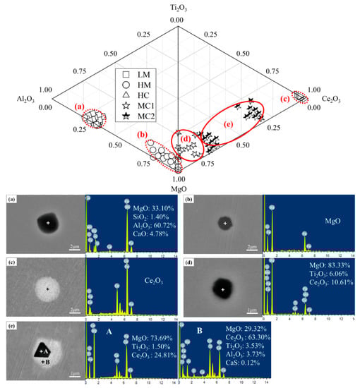 The phase diagram of the MgO-Ce2O3-Ti2O3-Al2O3 system and the morphology of typical inclusions. (a) Mg-Al-O inclusion; (b) Mg-O inclusion; (c) Ce-O inclusion; (d) Mg-Ce-Ti-O inclusion; (e) Mg-Ce-Ti-O composite inclusion.