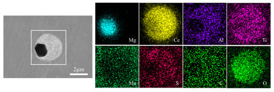Map scanning was used to further analyze the elemental compositions of typical Mg-Ce-O composite inclusion in MC steel, and the results are shown in Figure 2. The results of mapping analysis demonstrate that Ti and O elements are evenly distributed throughout the inclusion. Mg is the element concentrated in the core of the inclusion and overlaps with the black area in the inclusion. Ce and Al elements are primarily distributed in the outer part of the inclusion, resulting in a bright white color in the outer part of the inclusion. Mn, S, and C elements are not clearly enriched.