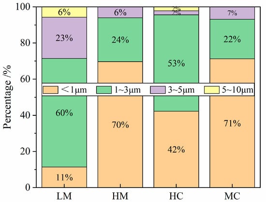 The inclusion size distribution was further analyzed statistically, as shown in Figure 4. The majority of the inclusions in standard steel (LM) are around 1–5 μm in diameter, accounting for 83% of the total. In addition, some large inclusions (5–10 μm) are observed with a ratio of 6%. The proportion of small inclusions (<1 μm) is significantly increased after Mg treatment, accounting for 70% of the total, which is 7.4 times that of standard steel. The proportion of 1–5 μm inclusions is significantly decreased, and 5–10 μm inclusions disappear. After Ce treatment, the proportion of small inclusions increases from 11% to 42%. The proportion of inclusions in the size range of 1–3 μm shows no obvious change,. In terms of inclusion size distribution, MC steel and HM steel exhibit similar characteristics.