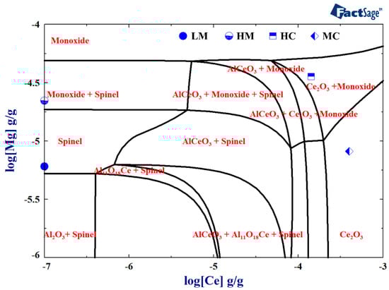 According to the Mg and Ce contents given in Table 1, it can be concluded that the equilibrium inclusion in LM steel is MgAl2O4. The equilibrium inclusions in HM and HC steel are MgO + MgAl2O4 and Ce2O3. When the Mg and Ce content are 32 and 340 ppm, respectively, MgO and Ce2O3 coexist as equilibrium inclusions in MC steel.