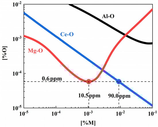 As shown in Figure 1 and Figure 5, the MgAl2O4 inclusions in standard steel are primarily modified to MgO and Ce2O3 after various treatments. As a result, dissolved [Al], [Mg], [Ce], and [O] equilibrations in standard steel at 1600 °C are calculated to better explain the evolutionary behavior of inclusions. Table 3 shows the deoxidation equilibrium of Al, Mg, and Ce. The interaction coefficients involved are shown in Table 4. Based on Henry’s Law and Wagener’s model, the calculation results are shown in Figure 6. It can be concluded that [Al] has poor deoxidation ability compared to [Mg] and [Ce]. When the [Mg] content is <10.5 ppm, the deoxidation ability increases with the increase of [Mg] content. On the contrary, the deoxidation ability decreases. Unlike [Mg], the deoxidation ability of [Ce] will be enhanced as its content increases.