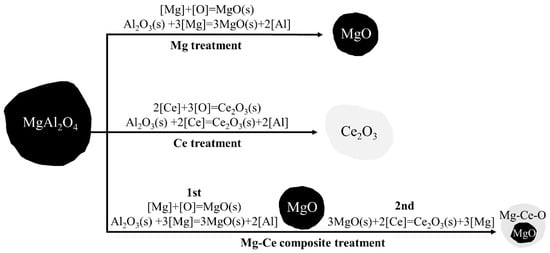When Mg or Ce is added to liquid steel, Al2O3 inclusions in MgAl2O4 will be transformed into MgO or Ce2O3 inclusions by [Mg] or [Ce], respectively, due to the strong deoxidization ability. Simultaneously, [Mg] or [Ce] will react directly with [O] in liquid steel to generate MgO or Ce2O3 inclusions, respectively. When Mg-Ce composite treatment, the addition of Mg preferentially makes the inclusions in the steel evolve into MgO. The increased Ce concentration will then be able to undergo a displacement reaction with MgO. However, it is insufficient to entirely replace all of the [Mg] in MgO due to insufficient [Ce] content. As a result, the inclusion types in MC steel are finally generated. In conclusion, the evolution mechanism of inclusions can be shown in Figure 7.