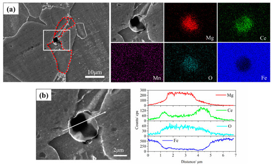 SEM micrograph and elemental distribution in a typical effective inclusion in MC steel. (a) mapping and (b) scanning images of the Mg-Ce-O composite inclusion.