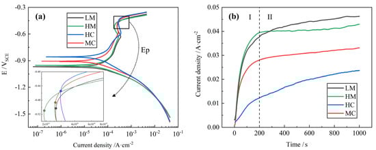 Polarization curves for the test steels. (a) Potentiodynamic polarization curve; (b) potentiostatic polarization curve.