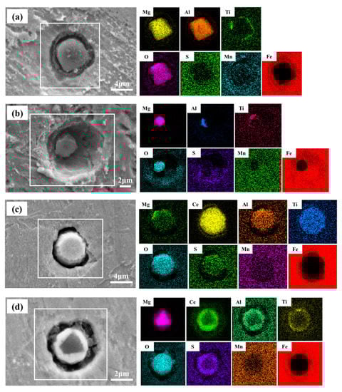 Pitting morphologies of typical inclusions. (a) MgAl2O4 in LM steel; (b) High-MgO in HM steel; (c) High-Ce2O3 in HC steel; (d) Mg-Ce-Al-Ti-S-O in MC steel.