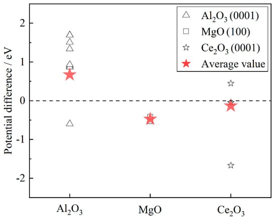 In order to compare the electronic work function between inclusions and Fe, the potential difference is calculated by Equation (3).
