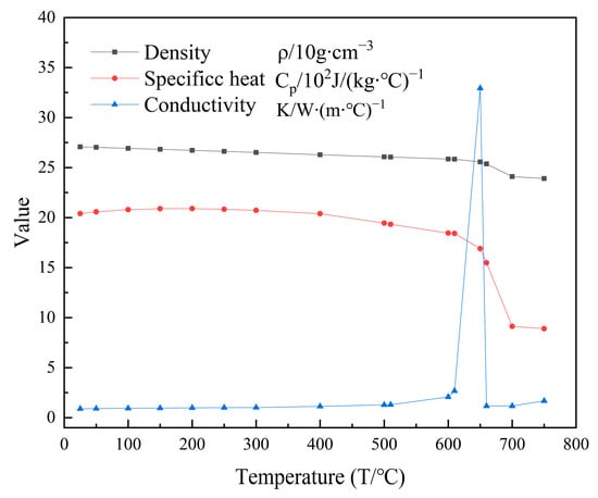 The base metal (BM) used in this research was the 6082-T6 aluminum alloy, which has a melting point temperature of approximately 630 °C. Then, the dimensions of the base material were selected as 100 mm × 300 mm × 4 mm. The chemical compositions of the 6082-T6 aluminum alloy and the welding wire (ER5356 of series 5) used in this study are elaborated in Table 2. Performing temperature field simulations necessitated thermal physical parameters at varying temperatures, encompassing material density, thermal conductivity, and specific heat capacity. Figure 3 presents the temperature and associated performance parameters based on references [20,21], in addition to data from the material property simulation software JMATPRO.