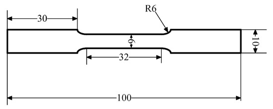 Subsequent to MIG welding, the tensile specimens and microstructure specimens were cut using a wire cutting machine. For mechanical properties, cuts were obtained in alignment with the ASTM E B557M-15 standard [23] as shown in Figure 4. Tensile strength and elongation were tested using a tensile testing machine. The Vickers microhardness tester was used to measure point by point from the center line of the weld to the BM. The applied load was 0.5 kgf, with a point spacing of 0.5 mm and a dwell time of 10 s. For microstructural examination, a specimen of 15 × 15 mm size was cut out, with the weld as the center line. The specimens were then sequentially sanded with papers of 180, 400, 800, 1000, 1200, 1500, and 2000 grit. The ground surface was mechanically polished and etched for 20 s using an etching reagent in compliance with the ASTM E 407-99 standard [24], which consisted of 1 mL HF + 200 mL H2O. The melt pool morphology and microstructure were examined using an optical microscope (OM). Scanning electron microscopy (SEM) at an accelerating voltage of 10 KV was used to observe the BM post-pull-off and the fracture morphology of the joint under varying parameters.