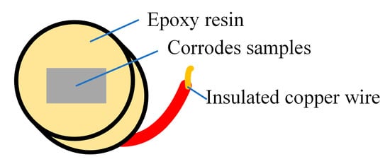 The corrosion resistance of the weld zone was assessed using an electrochemical workstation. The three-electrode method was adopted to perform corrosion tests on the weld area of the welded joint. A platinum electrode was chosen as the auxiliary electrode, and a saturated sugar acid electrode was chosen as the reference electrode. The sample from the weld zone was cut off as the working electrode, possessing a working area of 0.24 cm2, and the epoxy resin was embedded, as illustrated in Figure 5. Under the deoxidation condition at 25 °C, using a 3.5% NaCl solution, the scanning potential range was −1.4~−0.5 V, and the scanning speed was 1 mV/s.