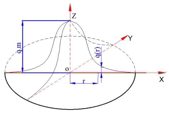 where qr is the heat flow density at any point of the equation, qm is the maximum heat flow density at the center of the heated spot, R is the effective heating radius of the arc, r is the distance from the arc heated spot at any point, and Q is the effective power of the welding heat source. Figure 6 provides a schematic representation of the Gaussian heat source model.
