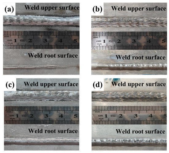 The morphologies of the MIG welds under varying heat inputs: (a) 2.34 KJ/mm, (b) 2.46 KJ/mm, (c) 2.57 KJ/mm, (d) 2.75 KJ/mm.