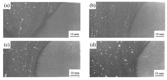 The cross section of the welded joint under varying heat inputs: (a) 2.34 KJ/mm, (b) 2.46 KJ/mm, (c) 2.57 KJ/mm, (d) 2.75 KJ/mm.