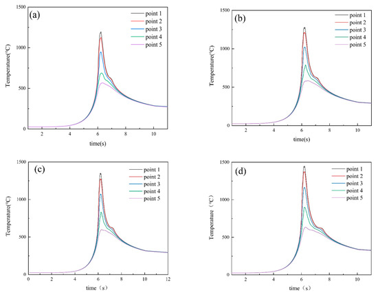 We aimed to gain a deeper understanding of the temperature change characteristics at the thickness interface, perpendicular to the direction of welding velocity. From the weld center to the fusion line, five nodes were selected every 1 mm as thermal cycle curve observation points. Additionally, they were named points 1–5. We performed an analysis of the temperature distribution and variation characteristics during MIG welding of the 6082-T6 aluminum alloy. The thermal cycle curves for these points are shown in Figure 10. When the heat source reached a selected point, the temperature of the point rapidly increased and the slope of the temperature curve sharply increased, resulting in a sharp climb in the temperature curve. After the temperature reached the maximum, the slope of the temperature curve became smaller because of air and other factors for cooling, which led to a decrease in the temperature curve and a rapid decrease in temperature. The temperature of the weld point reached a peak value higher than the melting point of the 6082-T6 aluminum alloy, thereby ensuring complete melting of the workpiece. Figure 10 demonstrates that under the same welding parameters, all five points reached peak temperature at the same time, the peak welding temperature decreased with increasing distance from the welding center, and the heat transfer diminishes with increasing distance from the welding center.