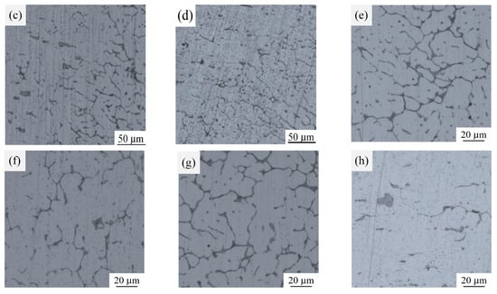 The welding zone comprised the WM, the heat affected zone (HAZ), and the BM. The heat input to the weld had a significant effect on the microstructure of the aluminum alloy. Figure 11a depicts the microstructure of the 6082-aluminum alloy base material, with the BM region featuring a matrix phase and uniformly distributed grains along the rolling direction. Since the main added elements of aluminum alloys are magnesium and silicon, the main strengthening phase was Mg2Si. The white part of the diagram was the α-AL solid solution, and the black dots indicate the reinforced phase.
