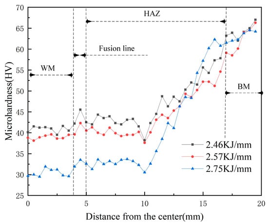 A hardness test was performed on welded joints with welding heat inputs of 2.46 KJ/mm, 2.57 KJ/mm, and 2.75 KJ/mm. The data acquired was utilized in Origin to produce a micro-hardness distribution diagram of welded joints, as displayed in Figure 12.