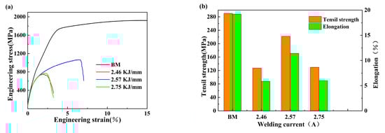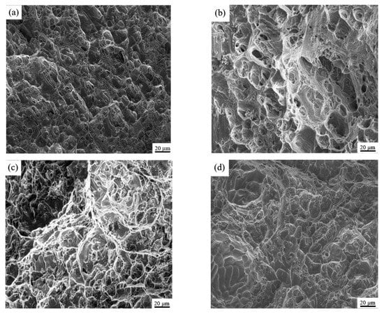 The microscopic image of the fracture, as shown in Figure 14, reveals that as the welding heat input increased from 2.46 KJ/mm to 2.57 KJ, the fracture was characterized by an equiaxial dimple whose size was like the BM. The toughness of the fracture significantly increased, and the toughness of the fracture was also the best. When the heat input rose to 2.75 KJ/mm, the size of the fracture dimple became coarse and local tearing occurred, which also led to a significant reduction in toughness. This observation, in conjunction with the elongation results after breaking in Table 4, further verifies that the mechanical properties of the welded joint are superior when the heat input reaches 2.57 KJ/mm compared to other parameters.