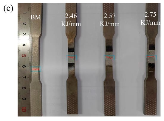 Mechanical properties of specimens at different heat inputs and base materials: (a) tensile curves, (b) tensile test results, (c) tensile break position.