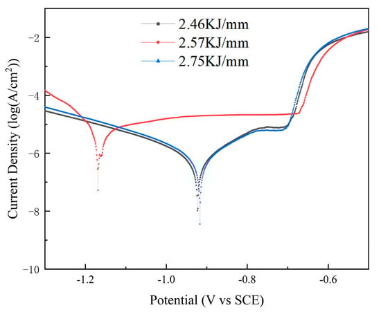 Table 5 presents the electrochemical corrosion parameters ascertained from polarization curves, with Icorr calculated using the extrapolation method. In general terms, a more positive Ecorr value denotes superior corrosion resistance [28]. As depicted in Figure 15, the corrosion resistance of the joint initially deteriorated, then improved as the welding heat input increased. At a welding heat input of 2.57 KJ/mm, the corrosion resistance of the joint was the worst, and when the welding heat input was 2.75 KJ/mm, the corrosion resistance of the joint was the best. From a dynamic perspective, a higher Icorr is correlated with a faster corrosion rate. As illustrated in Table 5, when the welding heat input reached 2.57 KJ/mm, the corrosion rate was quickest, and the corrosion resistance was weakest. When the heat input reached 2.75 KJ/mm, the corrosion rate slowed, and the corrosion resistance increased.