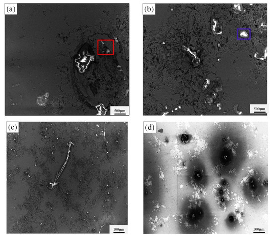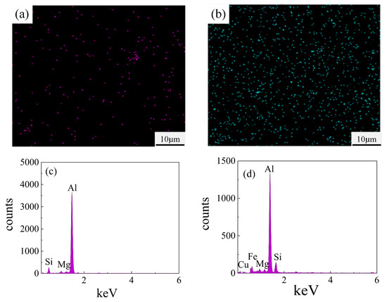 Figure 16 shows the micro-morphologies of pitting pits in the weld zone under varying welding heat inputs. It is evident that when the welding heat input was 2.57 KJ/mm, the pitting area was most widespread, and the pitting area was at its largest under this parameter. This observation corroborates the fact that the joint had the weakest corrosion resistance under this parameter. Figure 17 displays the layered image of EDS in the red box area of Figure 16a and the dot sweep energy spectrum of the rectangular area. The figure reveals that the black phase surrounding the pitting pit was the enrichment of Mg and Si elements, while the white phase was the enrichment of Fe, Si, and Cu elements. According to the analysis and prior studies, the black Mg2Si phase was the strengthening phase, while the white phase was the Al3Fe phase, Cu compound, and elemental Si. The Mg2Si hardening phase was the key factor impacting the corrosion performance of welded joints.