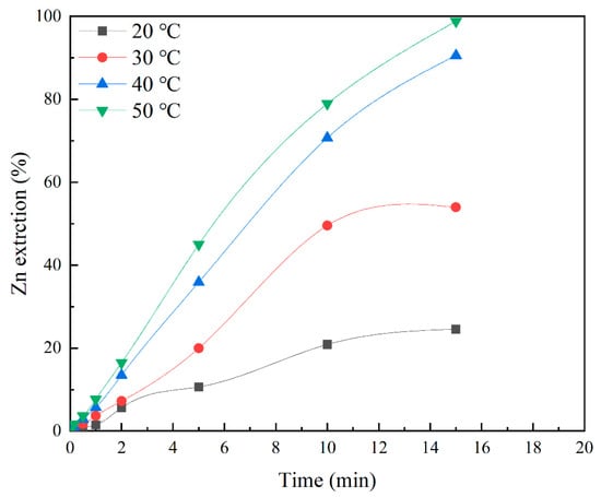 Effect of reaction temperature on the leaching of hemimorphite (The concentration of 5-sulfosalicylic acid, sample particle size, and stirring speed at 0.151 mol/L, 152.5 μm, and 500 rpm).