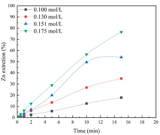 Experiments lasting 15 min were conducted to investigate the effect of the 5-sulfosalicylic acid concentration on the rate of zinc leaching. The investigated concentrations were 0.1, 0.130, 0.151 and 0.175 mol/L, respectively. The other experimental parameters of leaching with 5-sulfosalicylic acid were held unchanged at 303 K (30 °C), 152.5 μm and 500 rpm. The results are shown in Figure 3 and it is observed that hemimorphite dissolution rates increased dramatically with the rising extractant concentration. After reaction for 15 min, for the concentration of 5-sulfosalicylic acid of 0.1 mol/L, only 17.89% of zinc was leached, while for the concentration of 0.175 mol/L, 76.55% of zinc was leached. Thus, the results of concentration experiments showed that the concentration of the extractant is an important factor that can affect zinc extraction from hemimorphite.