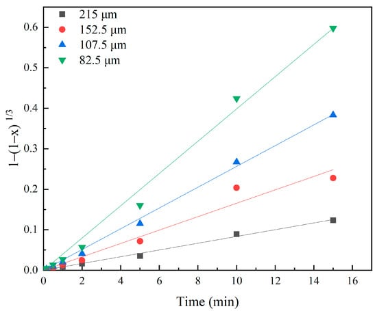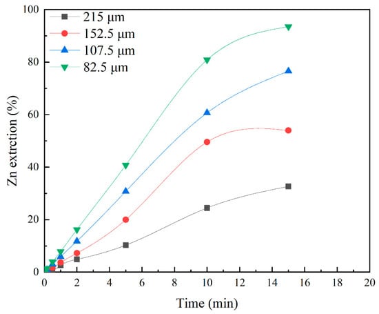 To explore the effect of the particle size (radius) on the rate of zinc dissolution, experiments with four distinct particle sizes (215, 152.5, 107.5, and 82.5 μm) and a duration of 15 min were carried out. The other experimental parameters of 5-sulfosalicylic acid leaching were held unchanged at 303 K (30 °C), 0.151 mol/L and 500 rpm. The results are shown in Figure 4, and it can be seen that the hemimorphite leaching rate increased significantly with the decrease in particle size. After leaching time of 15 min, the zinc leaching rate in the ore was only 32.66% for the particle size of 215 μm, but reached 93.49% for the particle size of 82.5 μm. As a result of the particle size tests, zinc extraction from hemimorphite was influenced by particle size. As the mineral particle size decreases, the total specific surface area increases, and the contact area between mineral particles and the leaching agent also increases, which promotes the leaching reaction. In addition, smaller particles show higher chemical reactivity, which also promotes the acceleration of the leaching reaction rate. The smaller the particle size, the better the leaching effect.