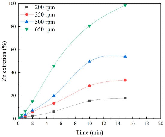 To investigate the effect of stirring speed on zinc dissolution, we conducted 15 min experiments at four different stirring speeds of 200, 350, 500, and 650 rpm, while maintaining the reaction temperature, concentration of 5-sulfosalicylic acid, and particle size at 303 K (30 °C), 0.151 mol/L, and 152.5 μm, respectively. The results are shown in Figure 5, and it is observed that the rate of hemimorphite dissolution increased significantly with the increase in stirring speed. The leaching rate of zinc for 15 min was only 17.98% at the stirring speed of 200 rpm, and was 98.60% at 650 rpm. Thus, the stirring rate test results show that the stirring speed is also an important factor that affects zinc extraction from hemimorphite. With the increase of stirring speed, the leaching rate also increases. When the mineral particle size is small and the specific surface area is large, there will be a phenomenon of “agglomeration” caused by the mutual attraction between particles caused by the charge of particles and the van der Waals force between molecules. In the case of slower stirring speed, the mechanical force provided by stirring cannot break up the “agglomeration” particles, resulting in a low leaching rate within a certain time. When the stirring speed is fast, the larger mechanical force will break up the “agglomeration” particles and re-disperse in the solution, and the increase in the stirring speed also increases the collision chance of mineral particles and leaching agent molecules, increases the effective collision, and improves the leaching rate of hemimorphite.