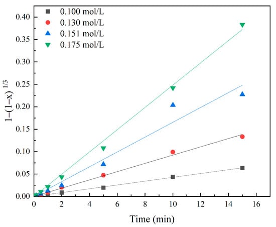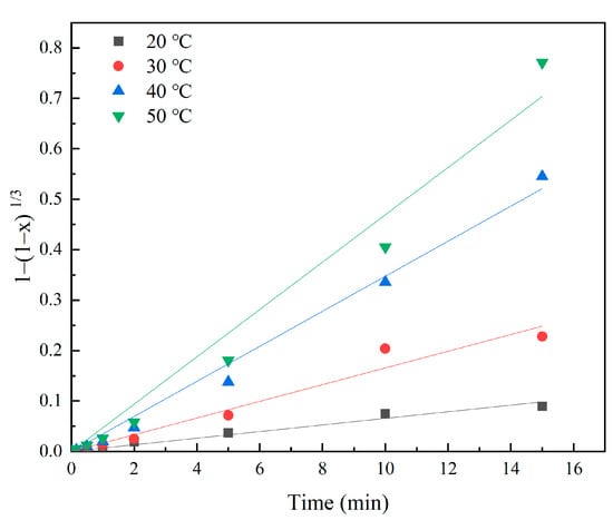 The data from the preceding experiments are summarized and analyzed. Table 3 summarizes the apparent rate constants and correlation coefficients calculated in the figure under experimental conditions. Clearly, the regression coefficients of Equations (4) and (5) are very low, indicating that these two processes are not the rate-controlling steps. The regression coefficient of Equation (6) is the best and is very close to 1, indicating that this model provides a good description of the factors controlling the leaching rate.