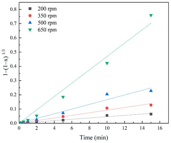 Plot of 1 − (1 − x)1/3 versus time for various stirring speeds.