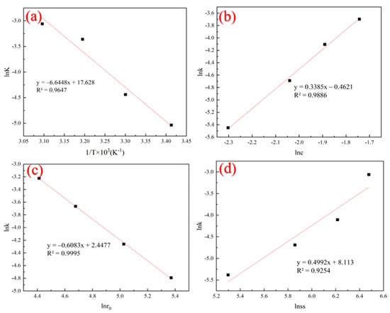 (a) Arrhenius plot of the leaching of hemimorphite. (b) Plot of ln k versus 5-sulfosalicylicacid concentrations. (c) Plot of ln k versus particle sizes. (d) Plot of ln k versus stirring speed.