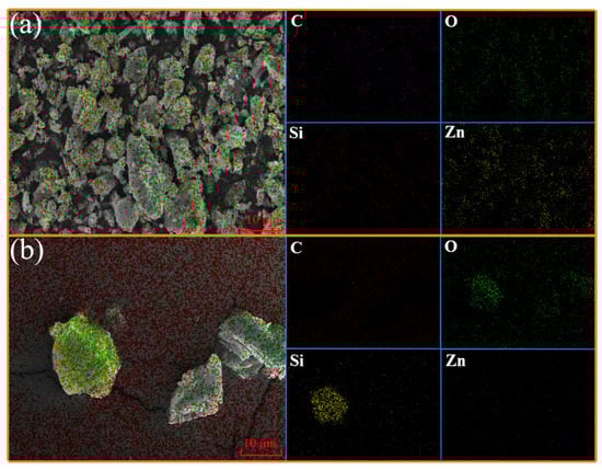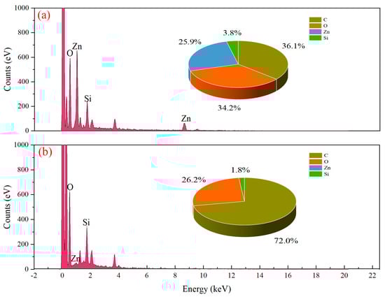SEM-EDS can be used to observe the changes of mineral surface morphology and semi-quantitative analysis of minerals to determine the leaching effect. SEM-EDS was used to determine the leaching effect of 5-sulfosalicylic acid on hemimorphite. Figure 11a,b illustrates the surface SEM morphology of hemimorphite and leaching residue after leaching, respectively. It can be seen from Figure 11a that the hemimorphite is distributed in blocks, and the particle size is large. As shown in Figure 11b, the leaching residue is also distributed in blocks, but the particle size is much smaller than that of the hemimorphite. To further prove the chemical composition of hemimorphite and leaching residue, the surfaces of the two samples were analyzed by EDS, and the results are shown in Figure 12. It must be pointed that the C shown in the Figure 12 came from the conductive adhesive, so it was not analyzed. The energy spectrum in Figure 12a shows the peaks of O, Si and Zn, and the atomic concentration of Zn and Si are 25.9% and 3.8%, respectively. The energy spectrum of Figure 12b also shows the peaks of O, Si and Zn, but the atomic concentration of Zn is almost 0 and the atomic concentration of Si is 1.8%, indicating that almost all of Zn is leached and a small amount of Si is leached, so the leaching effect is remarkable.