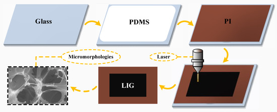 PI film with the thickness of 100 μm was ultrasonically cleaned, vacuum dried, and cut into a rectangle with the dimensions of 5 cm × 7 cm. The film was adhered onto a 5 cm × 8 cm glass sheet with PDMS and heated on a heating table at 80 °C for 3 min to solidify the PDMS and ensure that the PI film was tightly connected to the glass sheet. The preparation of the substrate was thus completed. The prepared substrate was fixed onto the platform of the laser engraving machine then subjected to laser etching under the conditions of the focal length of 13 mm, laser power of 10.0%, and scanning speed of 25 mm/s. The initial LIG was obtained on the surface of PI film after laser etching. It was separated from the glass sheet and trimmed into a suitable size with scissors. The preparation of LIG was thus completed. The whole preparation process is shown in Figure 1.